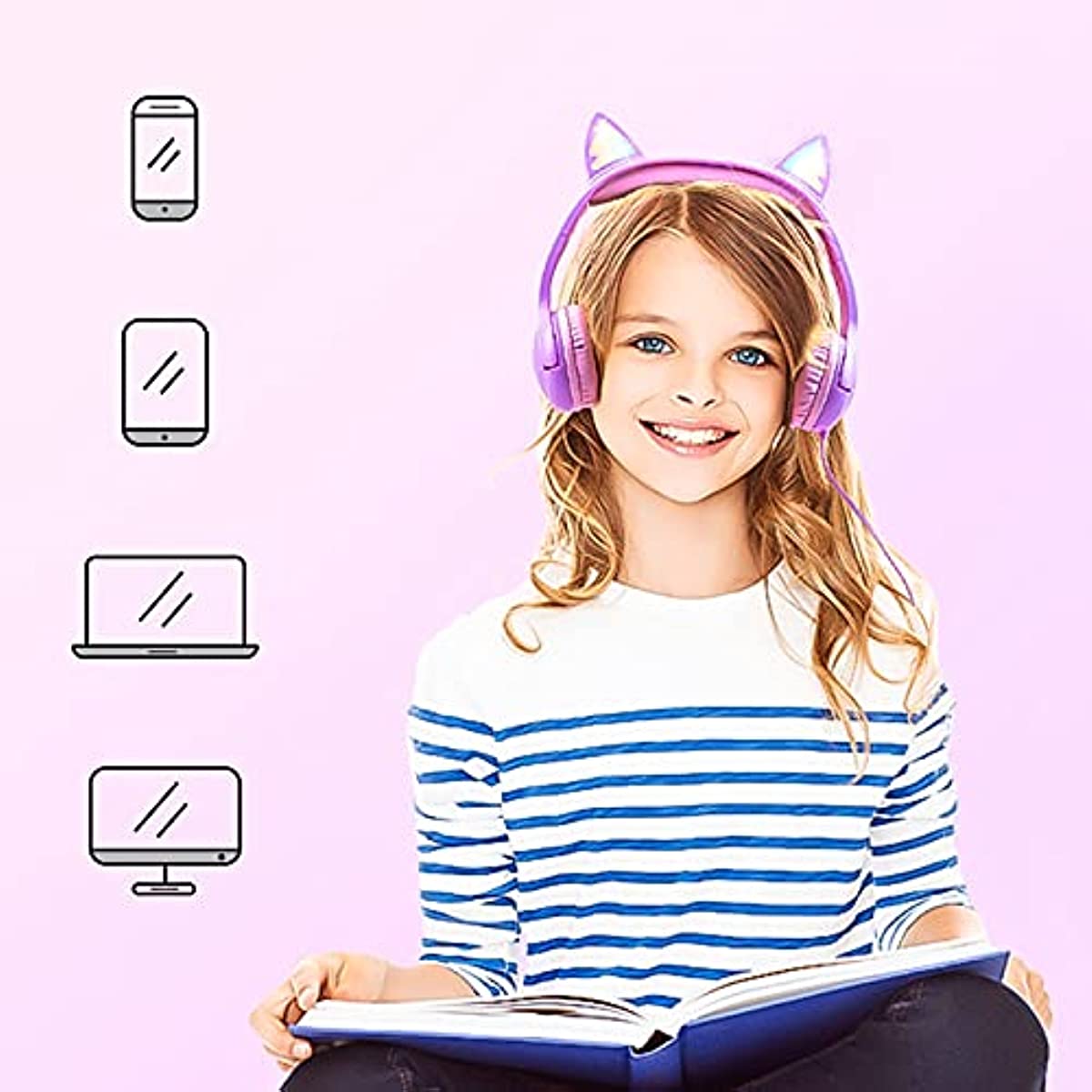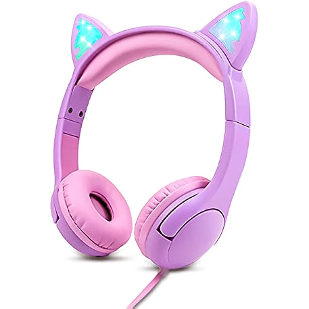 Olyre Kids Headphones, Safe 85db Volume Control Light Up Cat Ear Headphones for iPad Fire Tablet Kindle, On-Ear LED Children Headphones for School Learning Travel - Purple/Pink